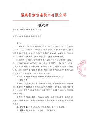 福建撲滿信息技術(shù)有限公司注冊地位于福建省福州市,是國內(nèi)《熱血傳奇》客戶端游戲獨占性版權(quán)人。對《熱血傳奇》客戶端游戲擁有全部版權(quán),并有權(quán)基于版權(quán)權(quán)利進行該游戲維權(quán)。株式會社傳奇IP (以下簡稱傳奇IP )對《The Legend of Mir 2》(中文名為“熱血傳奇"、或“傳奇”、“傳奇2”、“MIR II”)游戲(以下稱為 “授權(quán)作品”) 共同享有充分、完整且有效的著作權(quán)。經(jīng)傳奇IP授權(quán) , RENAISSANCE INVESTMENT MANAGEMENT LIMITED (以下簡稱 RENAISSANCE Ltd.)有權(quán)在中國大陸地區(qū)獨占性地對授權(quán)作品的網(wǎng)絡(luò)客戶端游戲進行開發(fā)、 發(fā)行、管理、宣傳、推廣和運營,針對授權(quán)作品的侵權(quán)游戲及侵權(quán)方,RENAISSANCE Ltd.有權(quán)采取必要的措施,并有權(quán)將前述權(quán)利分授權(quán)給第三人。福建撲滿信息技術(shù)有限公司經(jīng)RENAISSANCE Ltd.授權(quán),獲得上述權(quán)利,有權(quán)在中國大陸地區(qū)獨占性地對授權(quán)作品的網(wǎng)絡(luò)客戶端游戲進行開發(fā)、發(fā)行、管理、宣傳、推廣和運營,并有權(quán)對侵權(quán)行為/主體采取維權(quán)措施。